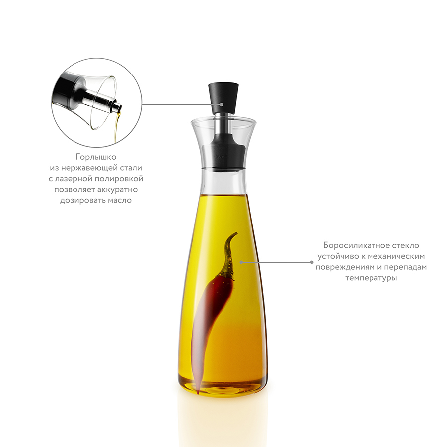 Особенность этого графина — инновационная технология Drip-free (“ни капли мимо”). Двойное горлышко позволяет гарантировать, что ни одна капля масла или уксуса не прольётся мимо, а плотно прилегающая пробка сохранит вкус и аромат. Стеклянные и металлические части можно мыть в посудомоечной машине.