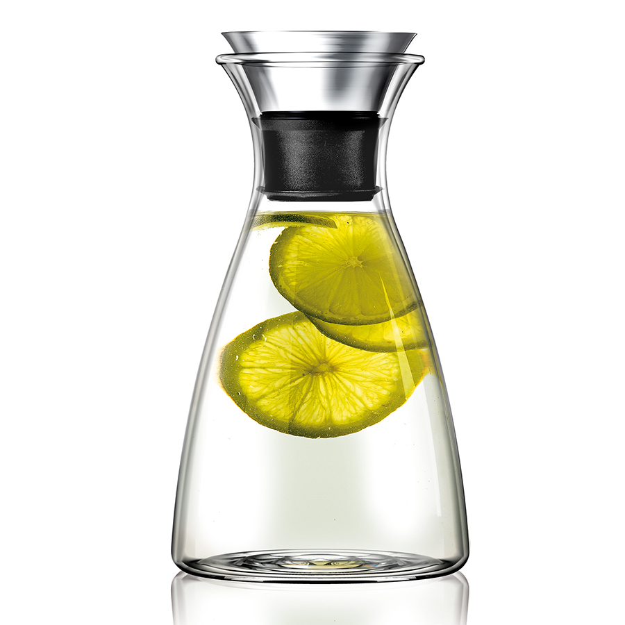 Главная особенность графина — инновационная технология Drip-free («ни капли мимо»). Двойное горлышко гарантирует, что ни одна капля напитка не прольется. Изделие выполнено из прочного боросиликатного стекла, которое не боится перепадов температур. Дополнительно к графину вы можете заказать крышку Flip. Она имеет силиконовую вставку, которая не даст кусочкам лимона или мяты попасть в стакан, а также она сама отодвигается, когда вы наклоняете бутылку.