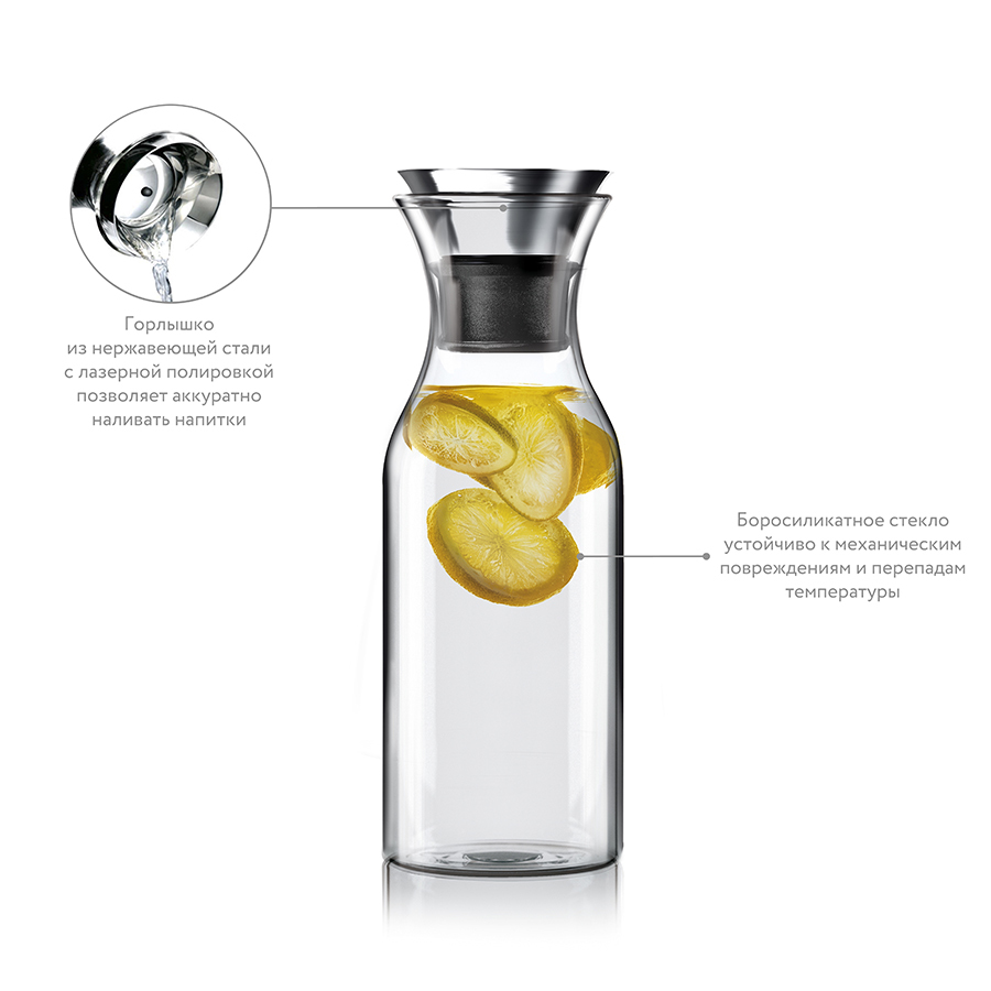 Емкость удобно хранить на полочке в дверце холодильника, размер подходит для большинства моделей. Корпус изготовлен из прочного закаленного стекла. Горлышко — из нержавеющей стали. Главная особенность графина — инновационная технология Drip-free («ни капли мимо»). Двойное горлышко гарантирует, что ни одна капля напитка не прольется.