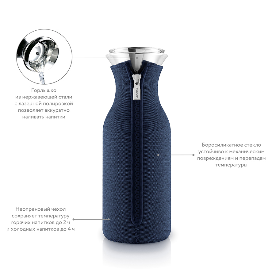 Мойка в посудомоечной машине: да Стильный лаконичный графин Fridge в текстильном чехле будет интересным дополнением любого кухонного интерьера. Модель имеет простую классическую форму колбы, большой объем (1 л), устойчивое дно и широкое горлышко drip-free, которое не позволяет напитку разбрызгиваться при наливании. Колба выполнена из боросиликатного стекла, устойчива к механическим повреждениям, высоким и низким температурам. Защитная герметичная крышка выполнена из нержавеющей стали и каучука. Неопреновый чехол на молнии выполняет не только декоративную функцию, но также сохраняет напитки теплыми. Колба подходит для мытья в посудомоечной машине, чехол стирается отдельно вручную.