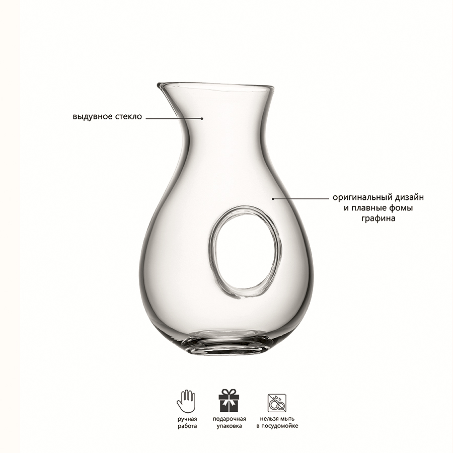 Графин Ono выполнен из выдувного стекла и привлекает внимание необычной формой с полостью в центре, которая может служить ручкой. Изделие упаковано в красивую коробку, благодаря чему станет прекрасным подарком для ценителей вин. Комбинируйте графин с другими предметами коллекции Ono для создания гармоничной композиции.