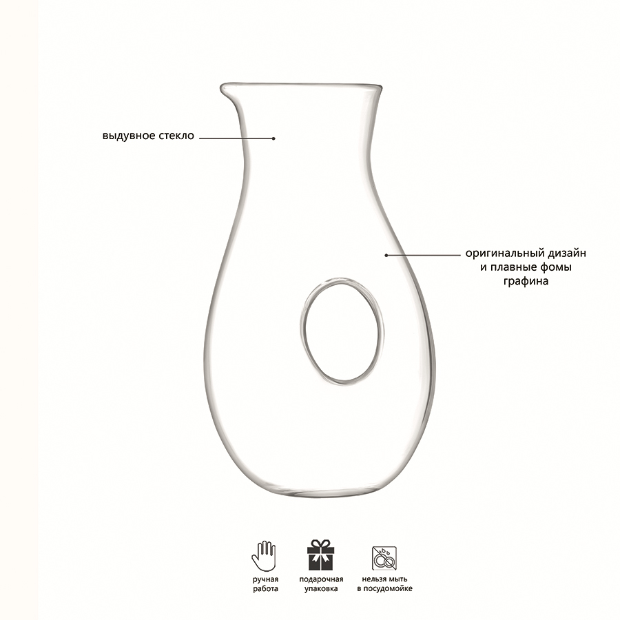 Графин Ono выполнен из выдувного стекла и подходит для подачи выдержанных насыщенных красных вин. Объем — 2,25 л. Изделие упаковано в красивую коробку и станет прекрасным подарком для ценителя вин. Комбинируйте его с другими предметами коллекции Ono для создания гармоничной композиции. Ono — коллекция декантеров и графинов ручной работы для сервировки благородных напитков. Оригинальный дизайн, плавные, скульптурные формы, декоративные отверстия — отличительные особенности серии. Изделие рекомендуется мыть вручную в тёплой мыльной воде и вытирать насухо мягкой тканью. Мелкие пузырьки внутри выдувного стекла не являются браком (круглые пузырьки < 3 мм и овальные пузырьки < 5 мм): это допустимые индивидуальные особенности изделий, изготовленных вручную.