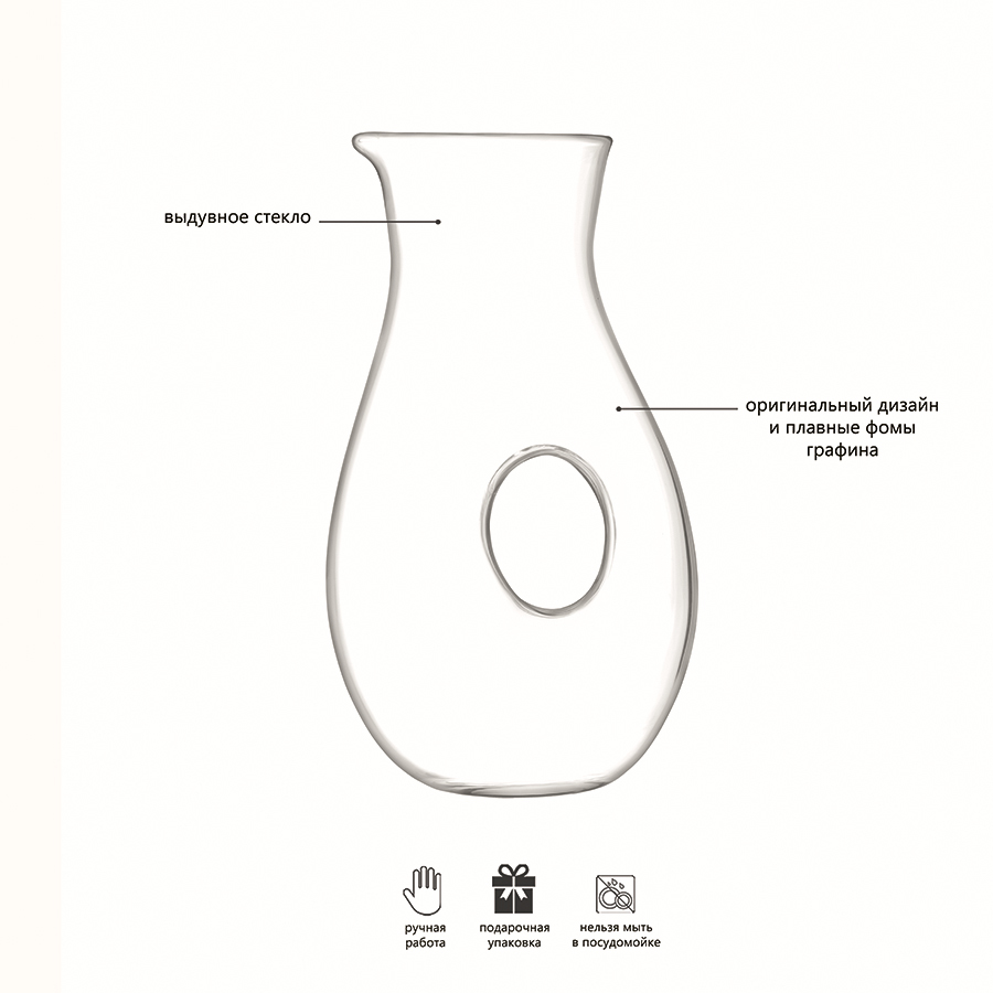 Графин Ono выполнен из выдувного стекла и привлекает внимание необычной формой с полостью в центре, которая может служить ручкой. Изделие упаковано в красивую коробку, благодаря чему станет прекрасным подарком для ценителей вин. Комбинируйте графин с другими предметами коллекции Ono для создания гармоничной композиции.