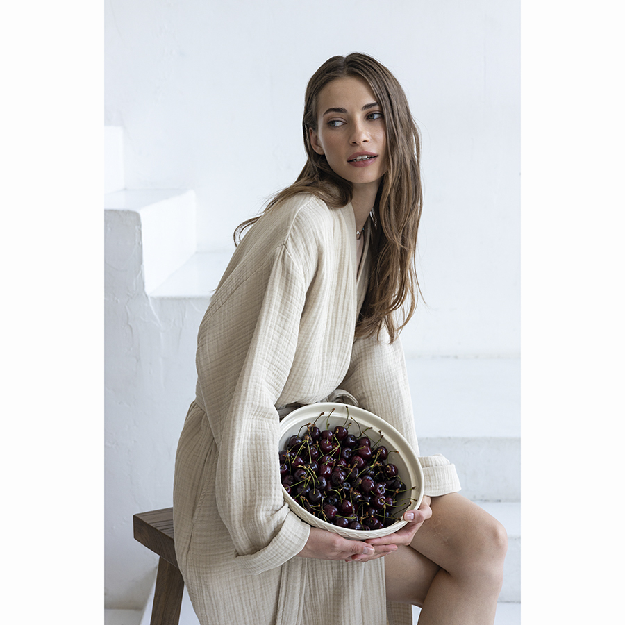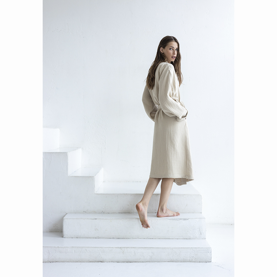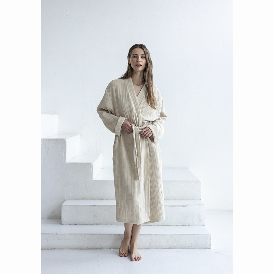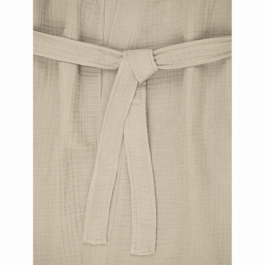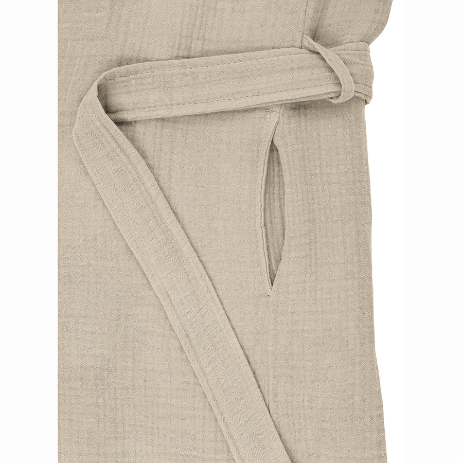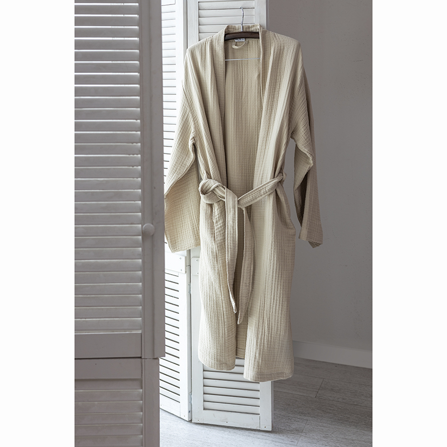 Халат из многослойного муслина бежевого цвета из коллекции Essential станет прекрасным выбором для ценителей качественного кроя и натуральных материалов. Мягкий, приятный к телу материал, изготовленный из 100% хлопкового волокна, позволяет коже дышать, хорошо впитывает и отводит влагу, быстро сохнет. Такой халат дарит чувство легкости и комфорта после ванны, душа, сауны или бассейна. За счет специального переплетения нитей в каждом из четырех слоев ткань имеет интересную мятую фактуру, обладает высокой плотностью, устойчивостью к износу, не скатывается и хорошо держит форму. Модель с шалевым воротником дополнена двумя карманами и широким поясом.