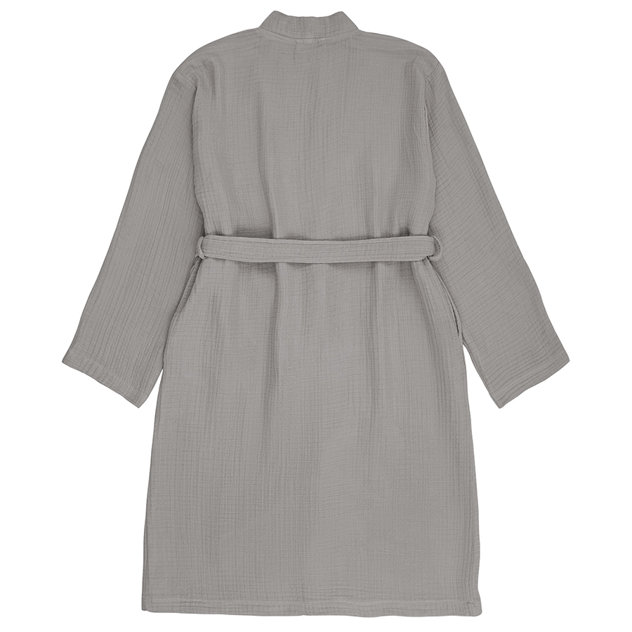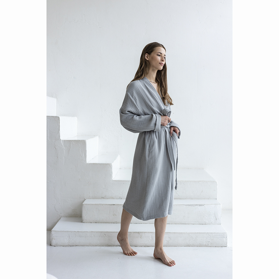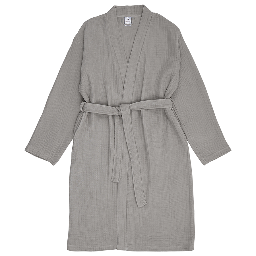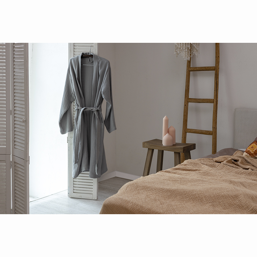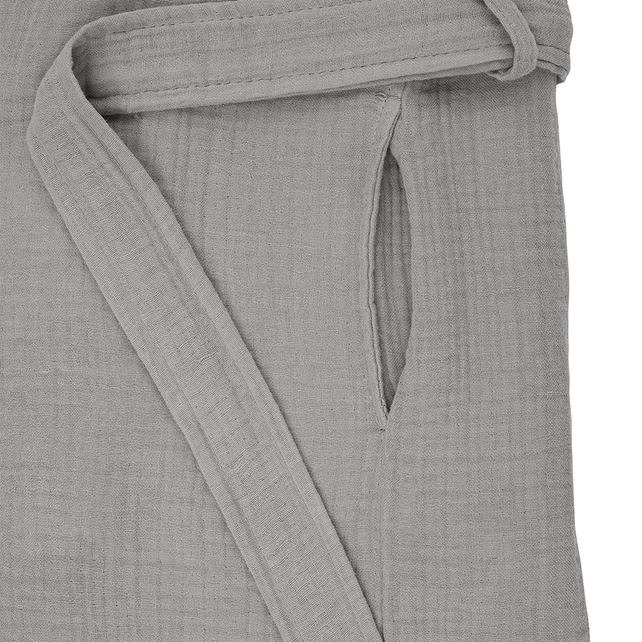 Халат из многослойного муслина серого цвета из коллекции Essential станет прекрасным выбором для ценителей качественного кроя и натуральных материалов. Мягкий, приятный к телу материал, изготовленный из 100% хлопкового волокна, позволяет коже дышать, хорошо впитывает и отводит влагу, быстро сохнет. Такой халат дарит чувство легкости и комфорта после ванны, душа, сауны или бассейна. За счет специального переплетения нитей в каждом из четырех слоев ткань имеет интересную мятую фактуру, обладает высокой плотностью, устойчивостью к износу, не скатывается и хорошо держит форму. Модель с шалевым воротником дополнена двумя карманами и широким поясом.