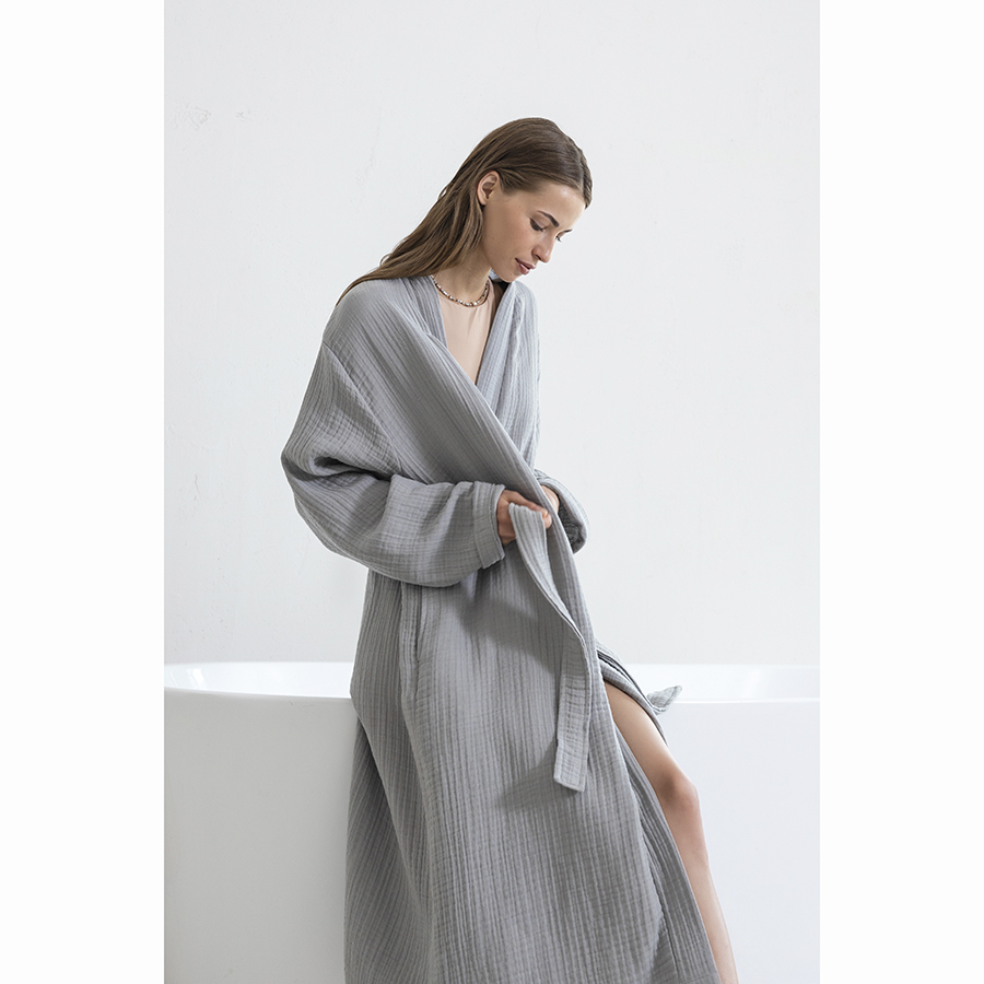 Халат из многослойного муслина серого цвета из коллекции Essential станет прекрасным выбором для ценителей качественного кроя и натуральных материалов. Мягкий, приятный к телу материал, изготовленный из 100% хлопкового волокна, позволяет коже дышать, хорошо впитывает и отводит влагу, быстро сохнет. Такой халат дарит чувство легкости и комфорта после ванны, душа, сауны или бассейна. За счет специального переплетения нитей в каждом из четырех слоев ткань имеет интересную мятую фактуру, обладает высокой плотностью, устойчивостью к износу, не скатывается и хорошо держит форму. Модель с шалевым воротником дополнена двумя карманами и широким поясом.
