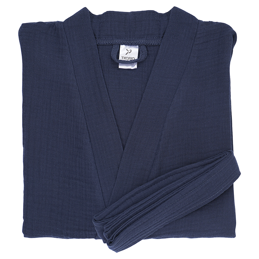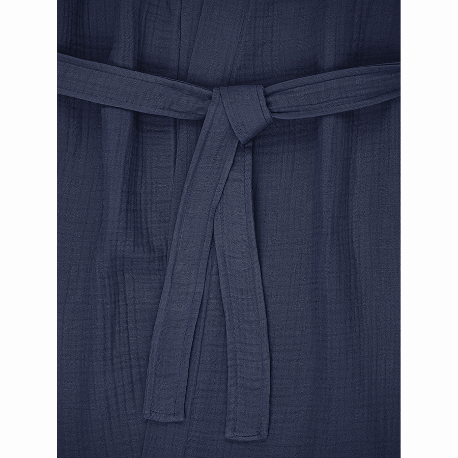 Халат из многослойного муслина темно-синего цвета из коллекции Essential станет прекрасным выбором для ценителей качественного кроя и натуральных материалов. Мягкий, приятный к телу материал, изготовленный из 100% хлопкового волокна, позволяет коже дышать, хорошо впитывает и отводит влагу, быстро сохнет. Такой халат дарит чувство легкости и комфорта после ванны, душа, сауны или бассейна. За счет специального переплетения нитей в каждом из четырех слоев ткань имеет интересную мятую фактуру, обладает высокой плотностью, устойчивостью к износу, не скатывается и хорошо держит форму. Модель с шалевым воротником дополнена двумя карманами и широким поясом.
