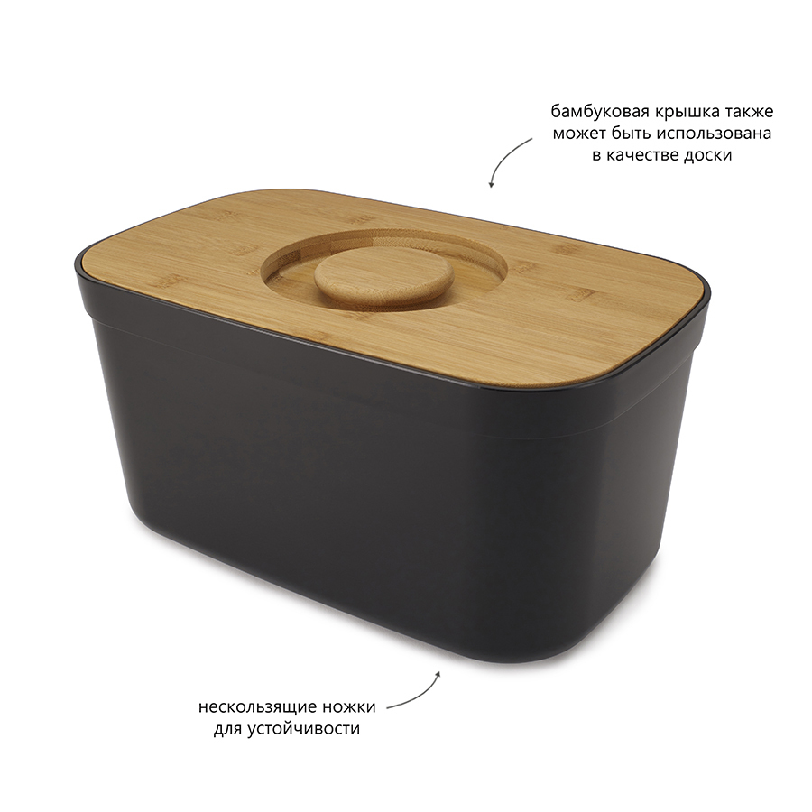 Черная пластиковая хлебница с разделочной доской из бамбука – практичное решение для хранения выпечки на любой кухне, Стильный контейнер занимает мало места и станет оригинальным украшением современного интерьера. Хлебница состоит из легко моющейся полипропиленовой основы с нескользящими ножками и высококачественной бамбуковой крышки, которая при переворачивании превращается в разделочную доску. Крышка оснащена эргономичной ручкой и канавками для удобного захвата. Основу можно мыть в посудомоечной машине. Для крышки рекомендовано только ручное мытье и сушка. Рекомендуется периодически смазывать крышку минеральным маслом, чтобы продлить срок эксплуатации. После мытья крышка должна полностью высохнуть, перед следующим использованием.