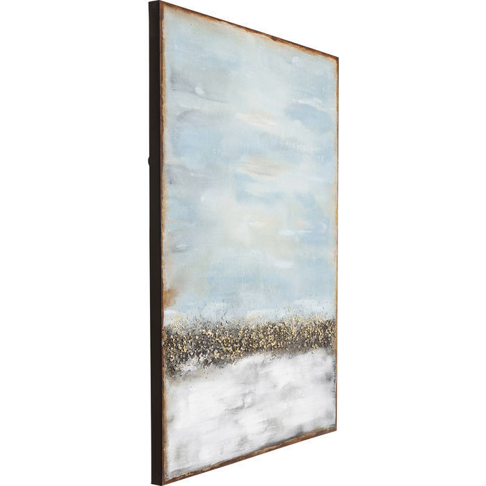 Декоративные элементы, такие как картины, принты и фотографии, дополняют стиль мебели - пусть ваши чувства решают! Абстрактное и импрессионистическое соединились в нежных кремовых, бежевых и голубых тонах. Словно звёздная пыль, картину окружает трёхмерная лента из камней и золотой мишуры. Ручная работа.