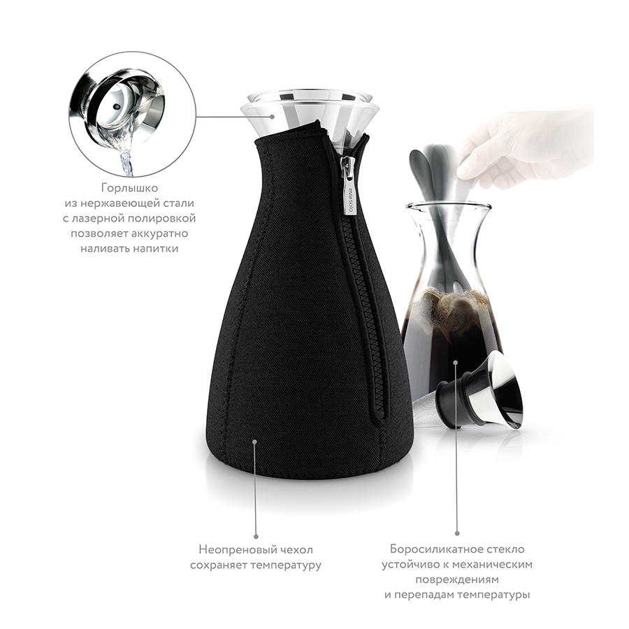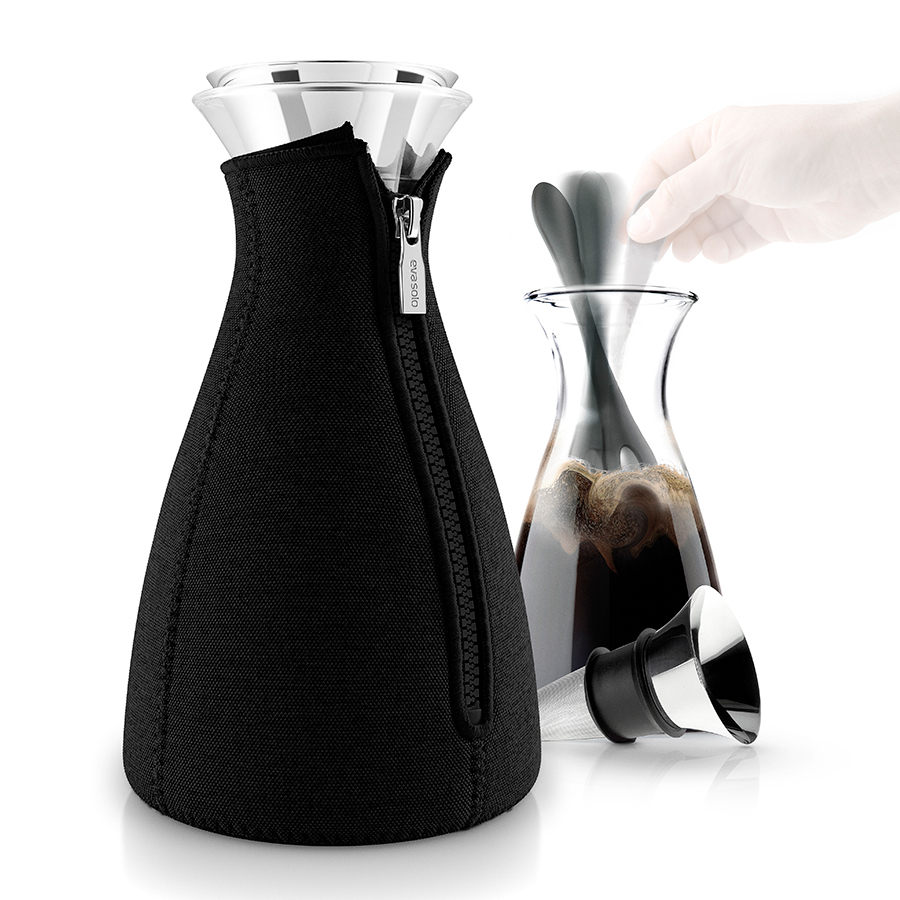 Стильный современный кофейник в термочехле – это незаменимый кухонный элемент для кофеманов. С помощью данного изделия процесс заваривания кофе будет легким и быстрым – достаточно просто засыпать в колбу молотый кофе, залить горячей водой и через четыре минуты бодрящий ароматный напиток будет готов. Колба имеет объем 1 л, выполнена из прочного боросиликатного стекла, благодаря чему выдерживает температурный диапазон от -70Со до 530Со. Широкое горлышко drip-free не допускает разбрызгивания капель при наливании. Черный неопреновый чехол на молнии позволяет напитку как можно дольше оставаться горячим. Колба подходит для мытья в посудомоечной машине, чехол стирается вручную.