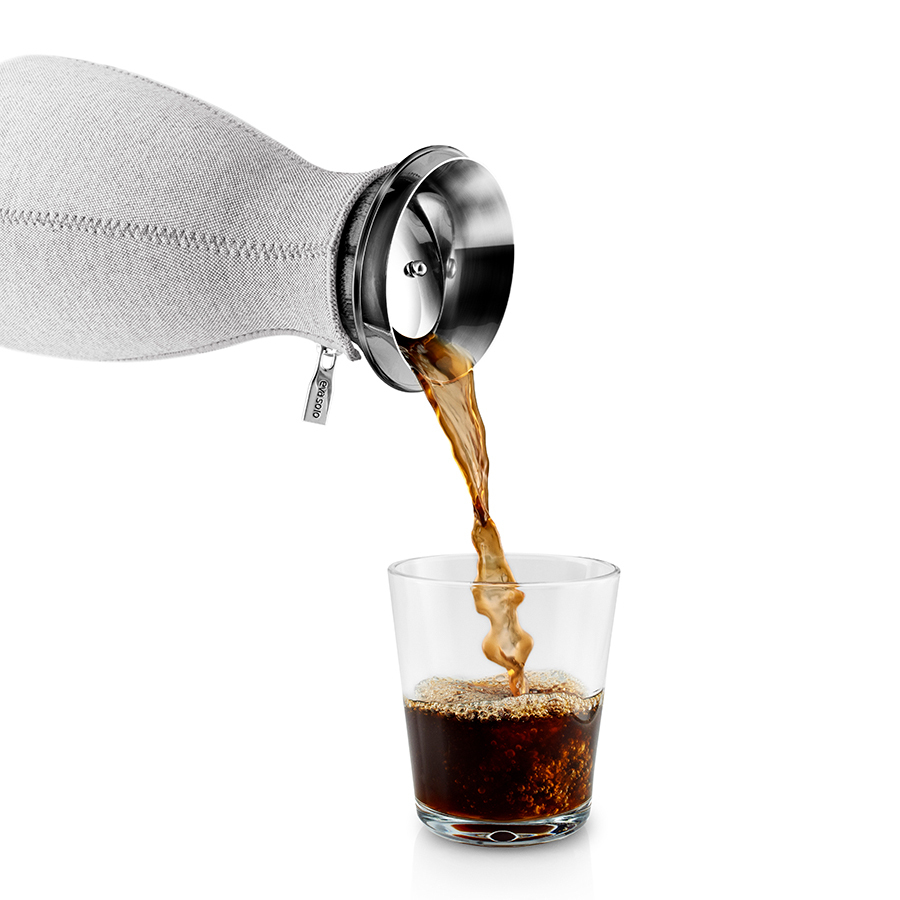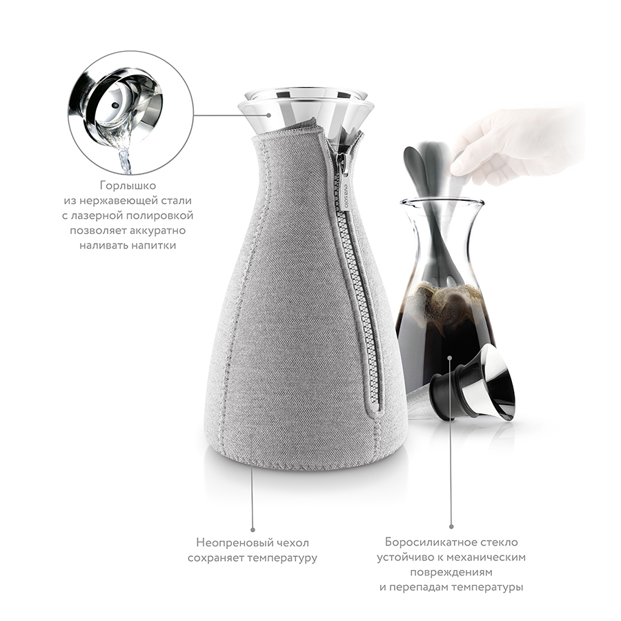 Стильный современный кофейник в термочехле – это незаменимый кухонный элемент для кофеманов. С помощью данного изделия процесс заваривания кофе будет легким и быстрым – достаточно просто засыпать в колбу молотый кофе, залить горячей водой и через четыре минуты бодрящий ароматный напиток будет готов. Колба имеет объем 1 л, выполнена из прочного боросиликатного стекла, благодаря чему выдерживает температурный диапазон от -70 С° до 530 С°. Широкое горлышко drip-free не допускает разбрызгивания капель при наливании. Светло-серый неопреновый чехол на молнии позволяет напитку как можно дольше оставаться горячим. Колба подходит для мытья в посудомоечной машине, чехол стирается вручную.