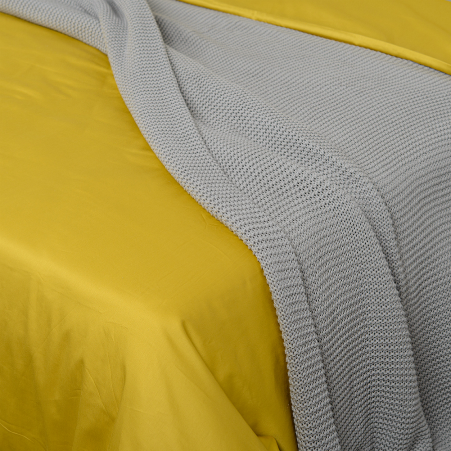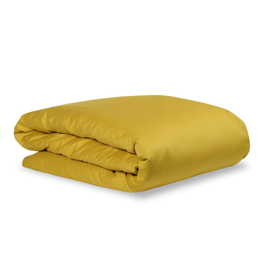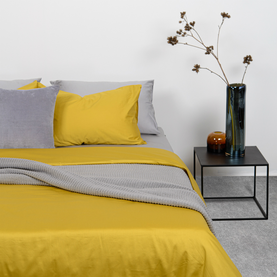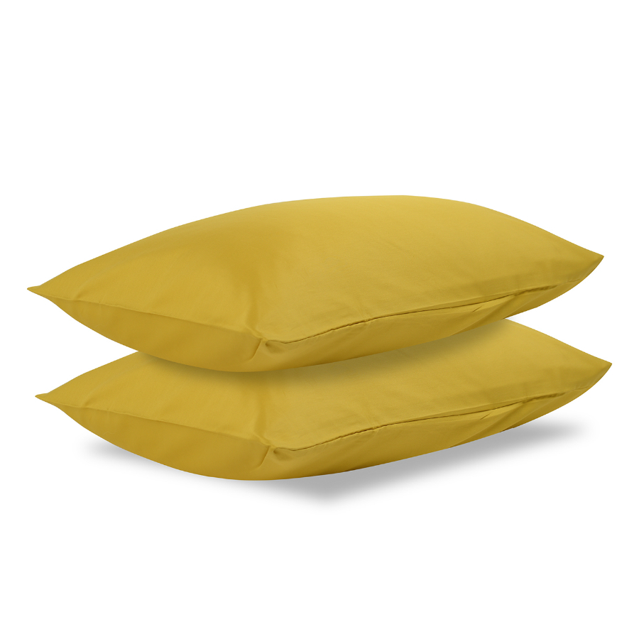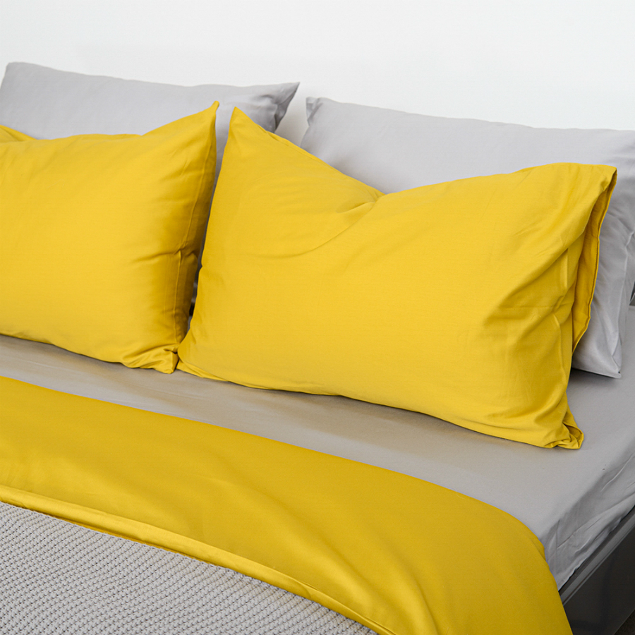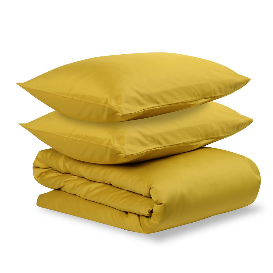 Пододеяльник и две наволочки 50х70 выполнены из плотного хлопкового сатина. Приятный на ощупь материал хорошо пропускает воздух, обеспечивая коже комфорт в течение сна. Однотонный комплект изготовлен в горчичном оттенке.