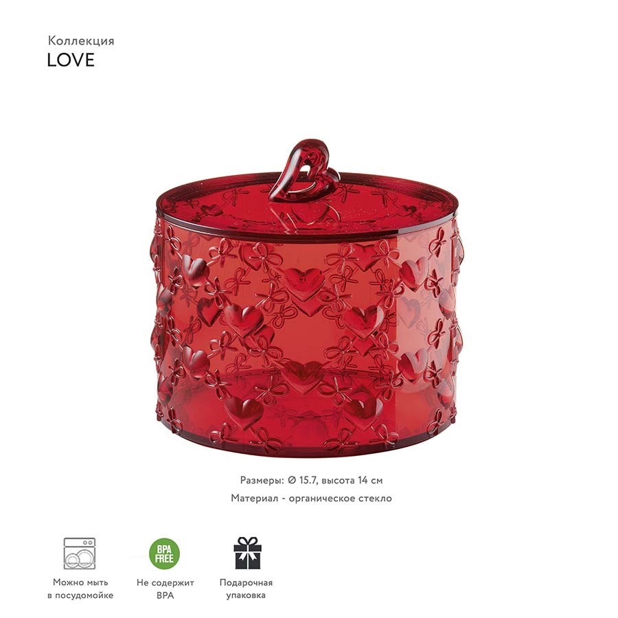 Контейнер выполнен из пластика и отлично подойдет для сервировки сахара, леденцов, печенья, конфет, орехов, мармелада и других десертов. Вазочка будет прекрасно смотреться на обеденном столе в кухне, гостиной или на открытой веранде. В контейнере также можно хранить приятные мелочи или принадлежности для рукоделия. Размеры: диаметр 15.7, высота 14 см. Комбинируйте разные цвета различных предметов коллекции для создания гармоничной композиции. Коллекция LOVE от Guzzini — это ода возвышенным чувствам и тренду на милые аксессуары. Все предметы коллекции упакованы в красивые коробки и станут отличным подарком всем девочкам, вне зависимости от возраста.