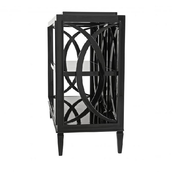Консоль выполнена из дерева чёрного цвета. Декорирована ажурной отделкой в виде пересекающихся кругов и дополнена двумя зеркальными полками.
