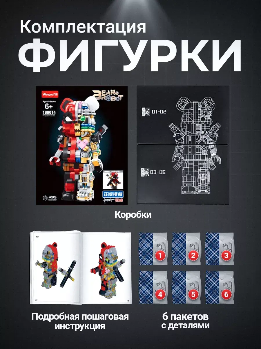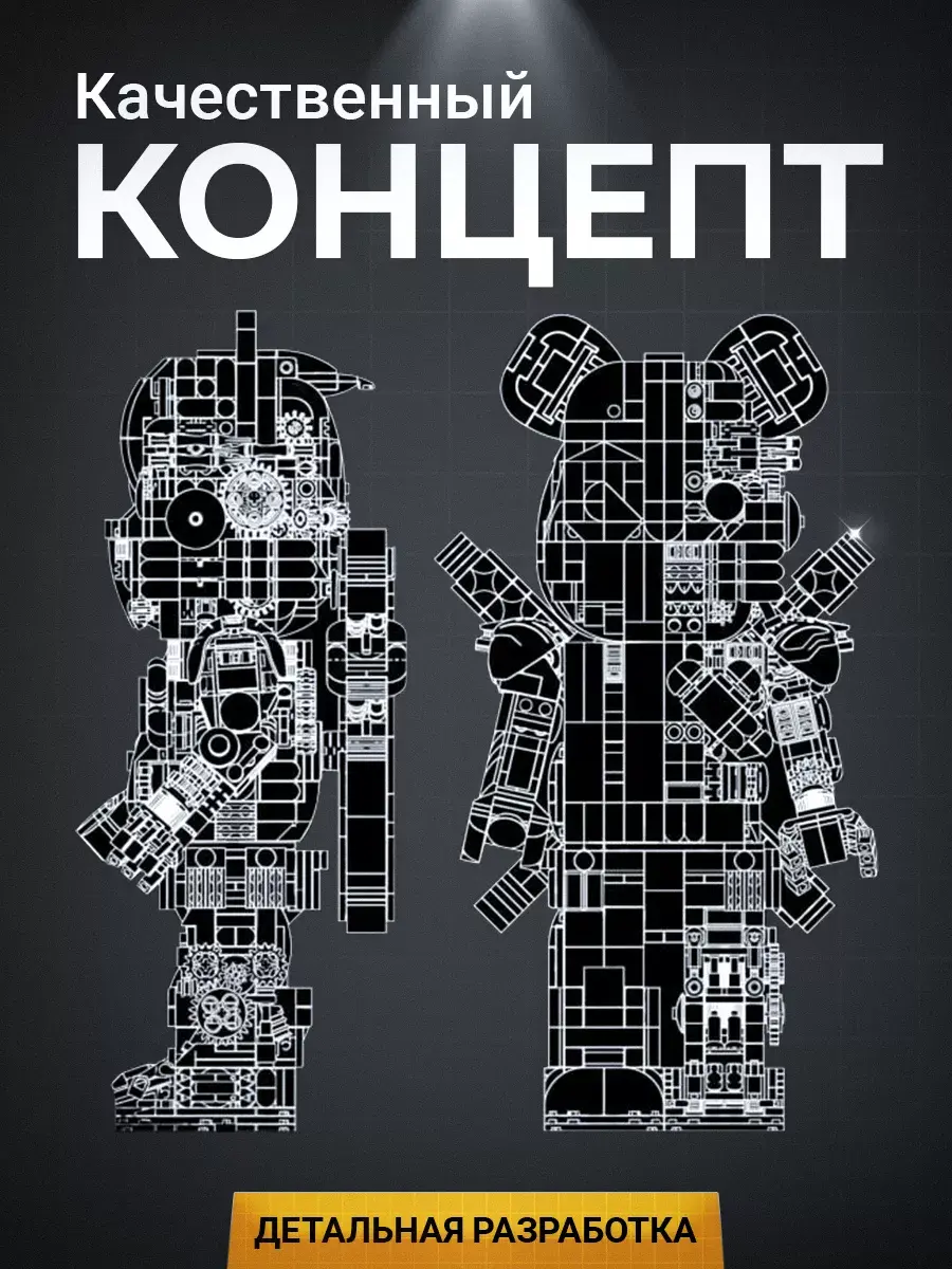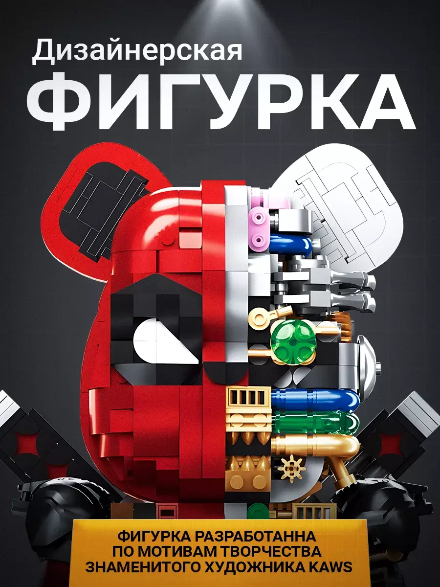 Конструктор Bear Robot - идеальный подарок для детей и взрослых. Этот уникальный набор, разработанный по мотивам творчества знаменитого художника Kaws, включает 800 деталей, позволяющих создать впечатляющую модель робота-медведя. Эта коллекционная дизайнерская игрушка была впервые представлена на выставке World Character Convention в Токио. Медведь выполнен в популярном стиле похожем на Bearbrick, что делает его не только игрушкой, но и стильным предметом коллекционирования и декора. Модель робота не только подвижна, но и имеет множество скрытых сюрпризов, что делает игру с ним еще увлекательнее. Этот детский конструктор способствует развитию у ребенка мелкой моторики, логического мышления и воображения. Пошаговая инструкция делает процесс сборки увлекательным и понятным, развивая абстрактное мышление и аналитические способности. Высокое качество деталей из прочного пластика обеспечивает безопасность и комфорт в использовании. Конструктор Робот-Медведь KAWS полностью совместим с наборами LEGO, что позволяет создавать уникальные комбинации и расширять коллекцию. Игра с пластиковым конструктором принесет радость и положительные эмоции, превращая каждую минуту игры в праздник. Развивающий игровой набор интересен как детям, так и взрослым, увлекая их в мир творчества и инженерного искусства. Интерактивный медведь впишется в любой интерьер, будь то дом или офис. Коллекционная фигурка вызовет восхищение и положительные эмоции у всех, кто увидит её! В нашем магазине также представлены другие конструкторы и игрушки по мотивам известных компьютерных игр, мультфильмов и кино. Конструктор 3д станет замечательным подарком для ребенка мальчика и девочки сына дочери на День рождения, 14 февраля, 23 февраля, 8 марта который они смогут с гордостью демонстрировать и использовать в своих играх. Подарите своим детям и близким радость творчества с конструктором Робот-Медведь!