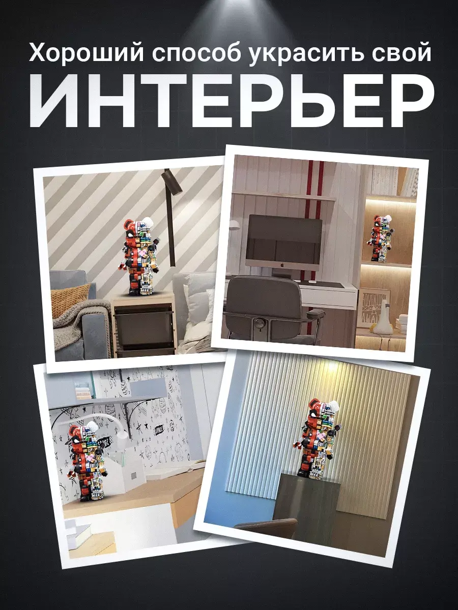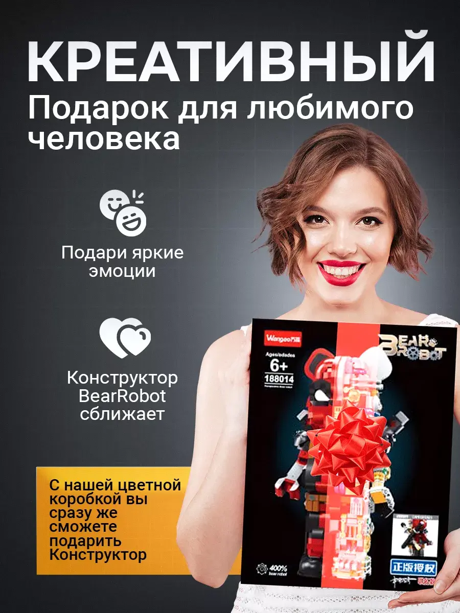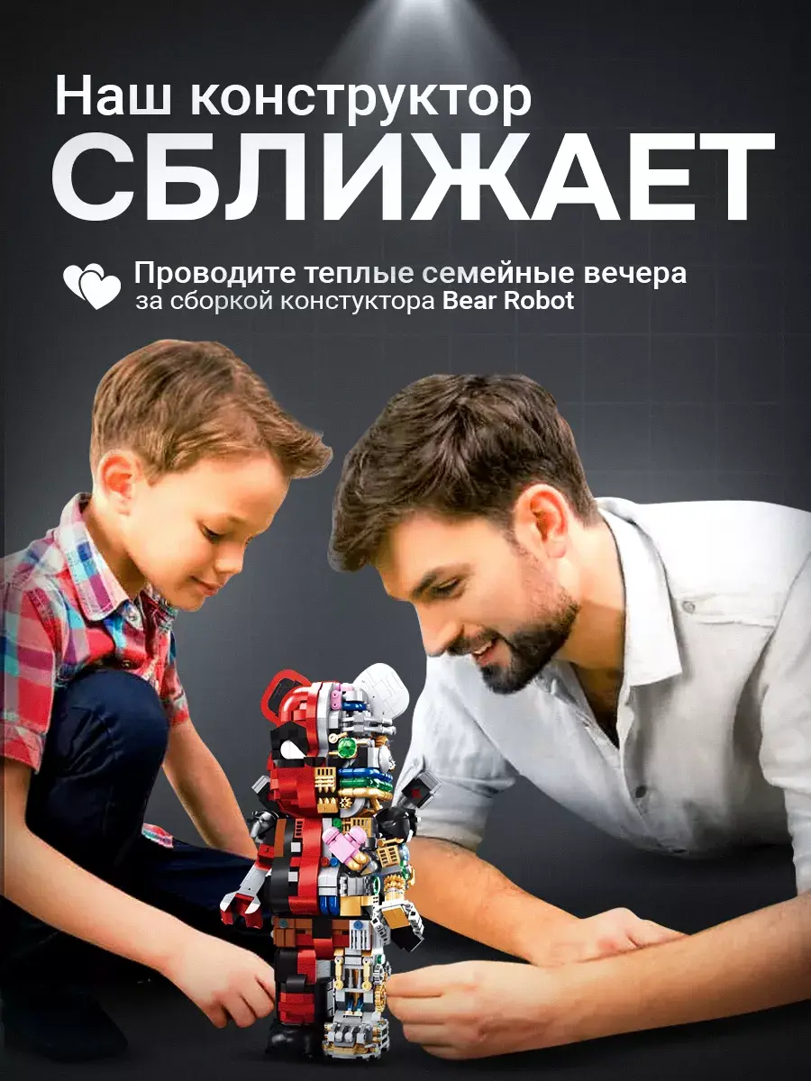 Конструктор Bear Robot - идеальный подарок для детей и взрослых. Этот уникальный набор, разработанный по мотивам творчества знаменитого художника Kaws, включает 800 деталей, позволяющих создать впечатляющую модель робота-медведя. Эта коллекционная дизайнерская игрушка была впервые представлена на выставке World Character Convention в Токио. Медведь выполнен в популярном стиле похожем на Bearbrick, что делает его не только игрушкой, но и стильным предметом коллекционирования и декора. Модель робота не только подвижна, но и имеет множество скрытых сюрпризов, что делает игру с ним еще увлекательнее. Этот детский конструктор способствует развитию у ребенка мелкой моторики, логического мышления и воображения. Пошаговая инструкция делает процесс сборки увлекательным и понятным, развивая абстрактное мышление и аналитические способности. Высокое качество деталей из прочного пластика обеспечивает безопасность и комфорт в использовании. Конструктор Робот-Медведь KAWS полностью совместим с наборами LEGO, что позволяет создавать уникальные комбинации и расширять коллекцию. Игра с пластиковым конструктором принесет радость и положительные эмоции, превращая каждую минуту игры в праздник. Развивающий игровой набор интересен как детям, так и взрослым, увлекая их в мир творчества и инженерного искусства. Интерактивный медведь впишется в любой интерьер, будь то дом или офис. Коллекционная фигурка вызовет восхищение и положительные эмоции у всех, кто увидит её! В нашем магазине также представлены другие конструкторы и игрушки по мотивам известных компьютерных игр, мультфильмов и кино. Конструктор 3д станет замечательным подарком для ребенка мальчика и девочки сына дочери на День рождения, 14 февраля, 23 февраля, 8 марта который они смогут с гордостью демонстрировать и использовать в своих играх. Подарите своим детям и близким радость творчества с конструктором Робот-Медведь!
