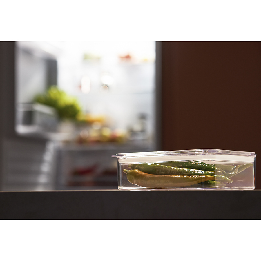 - Контейнер выполнен из SAN-пластика, который обладает высокой прочностью, не впитывает запахи и не вступает в химическую реакцию с продуктами.