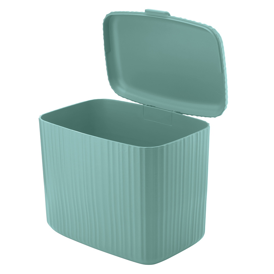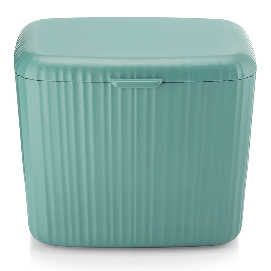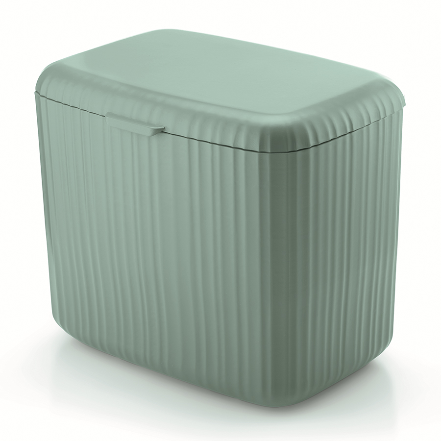 Изделие выполнено из переработанного пластика PET. Изделие покрыто специальным материалом с антибактериальными свойствами. Крышка открывается и закрывается одной рукой. Контейнер можно расположить на столешнице или повесить на дверцу кухонного шкафчика.