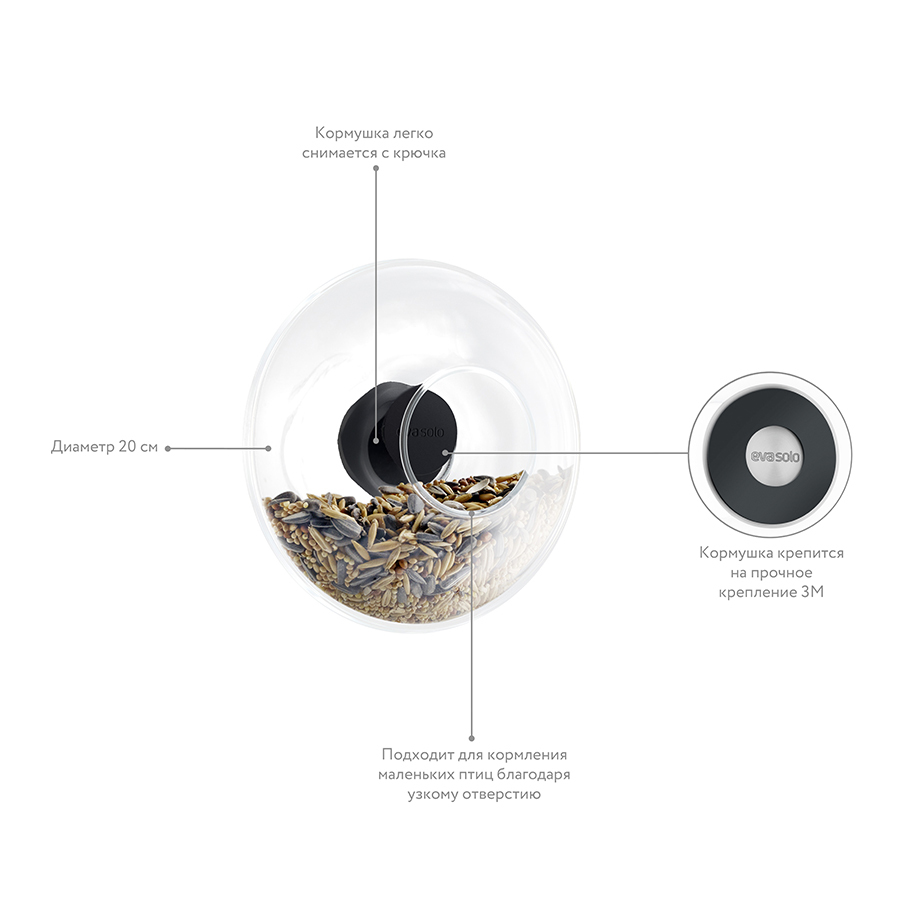 Кормушка крепится на прочное крепление 3M. Когда вы захотите вымыть окно или насыпать новую порцию корма, просто аккуратно снимите кормушку, а затем снова навесьте на то же крепление. Стекло морозоустойчиво, поэтому может находиться на улице круглый год.