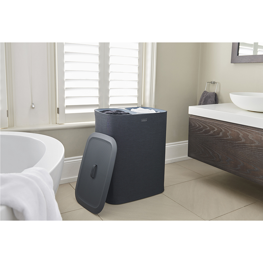 Корзина для белья с двумя отделениями поможет навести порядок в ванной или постирочной, а также облегчит процесс подготовки к стирке.