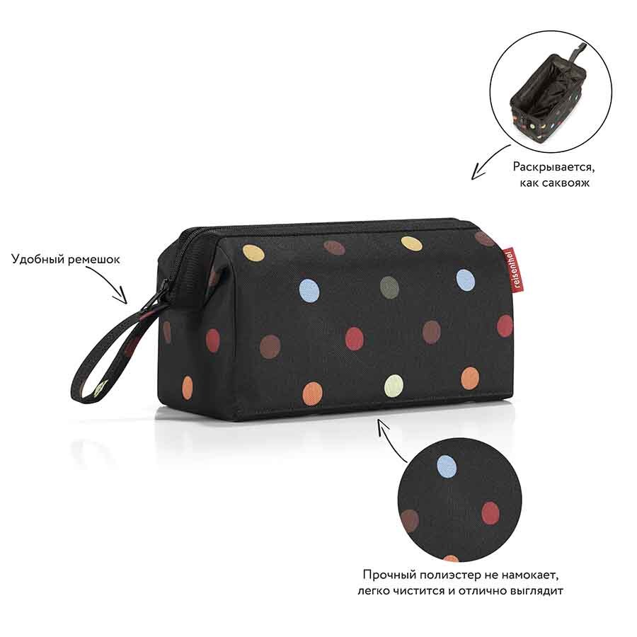 Металлические скобы в основании делают конструкцию устойчивой даже в трясущемся поезде. Внутри - карман на молнии и три открытых кармашка. Сбоку - удобный ремешок для переноски. Внутренний объем - 4 л.