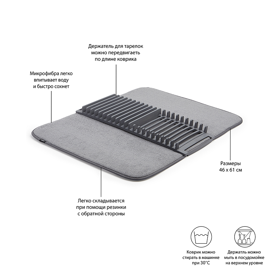 Коврик удобен для сушки чашек, стаканов и глубоких мисок, а подставка – для тарелок и блюдец. Легко разбирается для удобной чистки. Для хранения компактно складывается и закрепляется с помощью эластичных завязок.