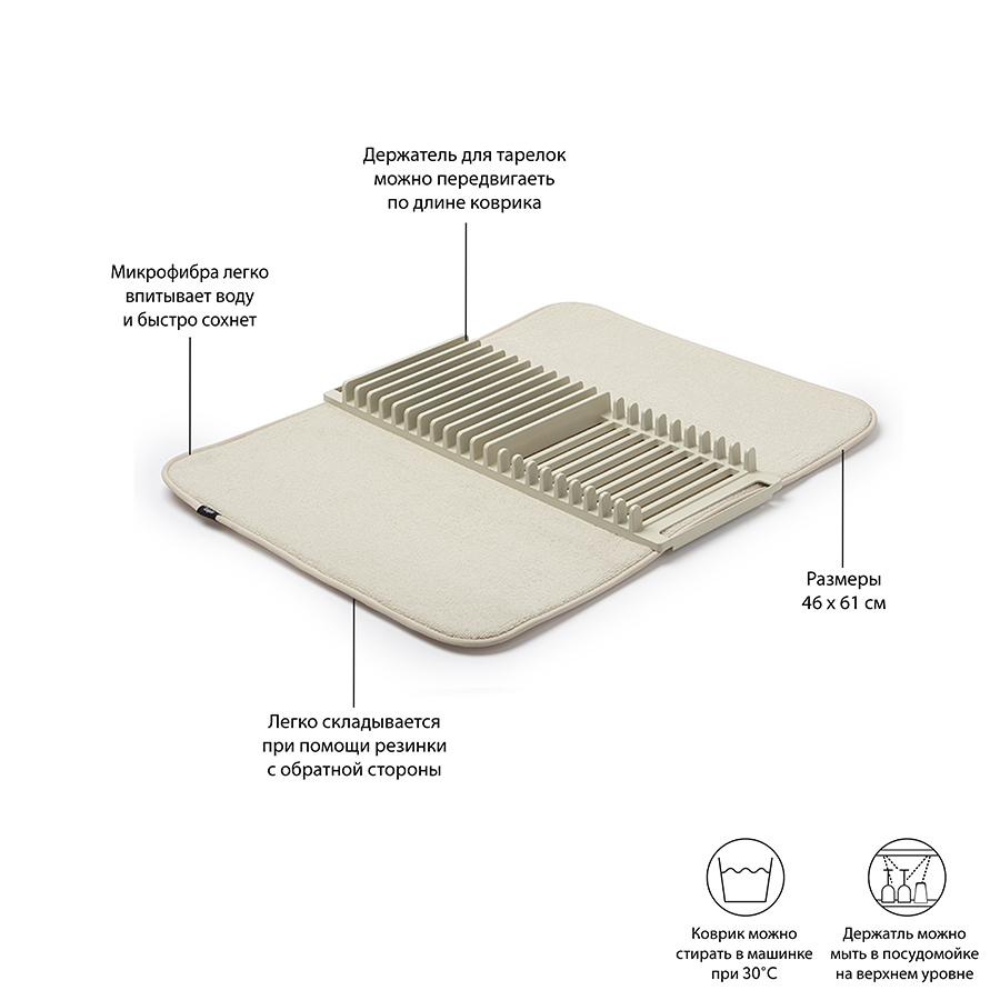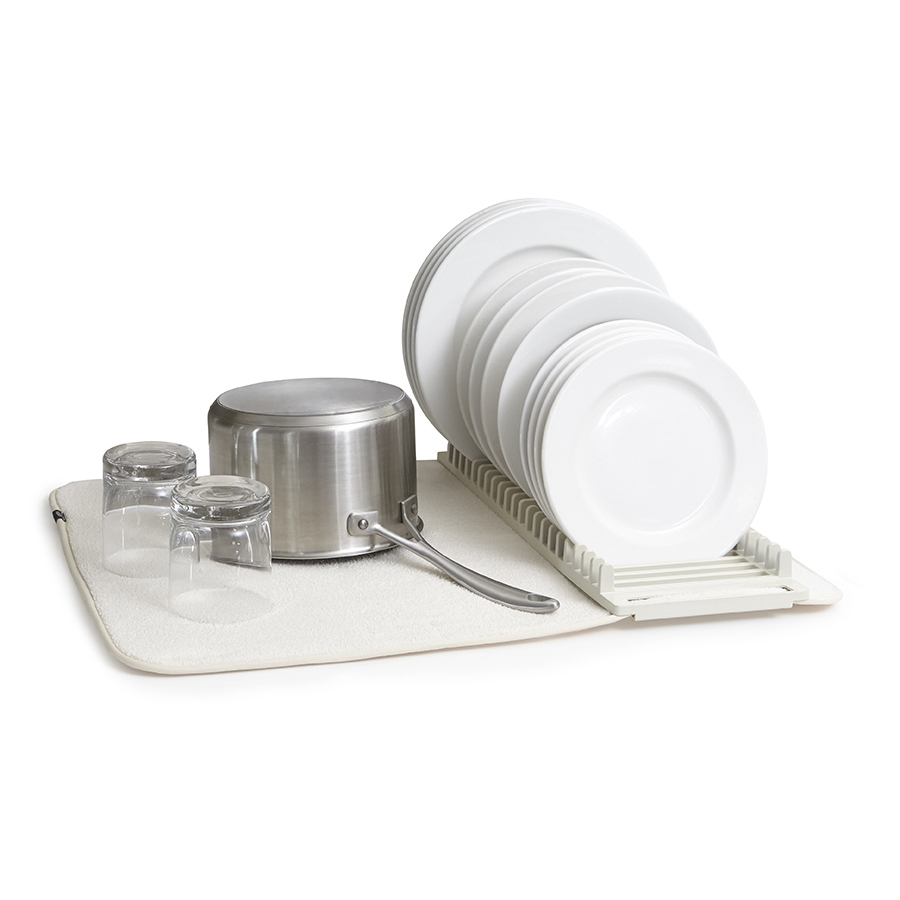 Функциональный предмет 2-в-1, в котором объединены коврик и подставка для сушки посуды. Коврик удобен для сушки чашек, стаканов и глубоких мисок, а подставка — для тарелок и блюдец. Легко разбирается для удобной чистки. Для хранения компактно складывается и закрепляется с помощью эластичных завязок. Размеры в разложенном виде: 61 x 45.8 x 2.5 см Дизайн: David Green