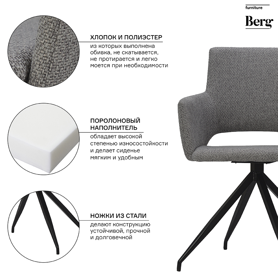 Конструкция устойчива и долговечна. Обивка кресла – прочная рогожка, которая не скатывается, не протирается и легко моется при необходимости. Ножки выполнены из стали. Наполнитель – поролон. Максимальная нагрузка – 120 кг.