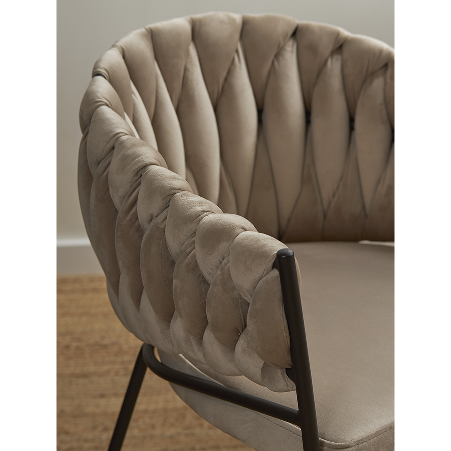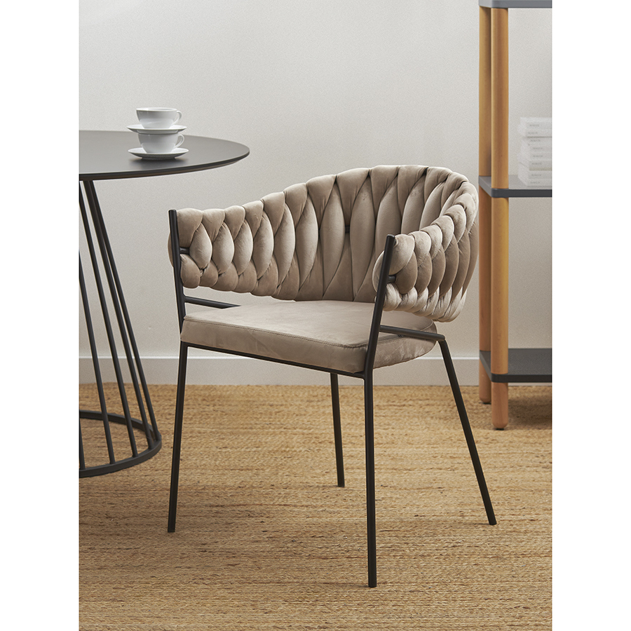 Кресло Lind поможет сделать акцент на стильном дизайне интерьера. Главная особенность модели – оригинальная плетеная спинка. Бархатистый, приятный на ощупь велюр дарит тактильный комфорт и смягчает строгие формы прочного железного каркаса. За счет высоких ножек модель выглядит утонченно, благодаря чему не перегружает пространство. Сиденье с наполнителем из пенополиуретана, глубокая посадка и наличие подлокотников обеспечивают комфорт во время отдыха. Мебель в спокойных тонах станет оптимальным вариантом для спальни, гостиной, кабинета, оформленных в любой цветовой гамме.