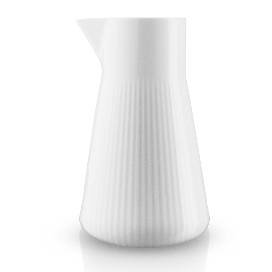 Кувшин выполнен из высококачественного белого фарфора с рифленой поверхностью.