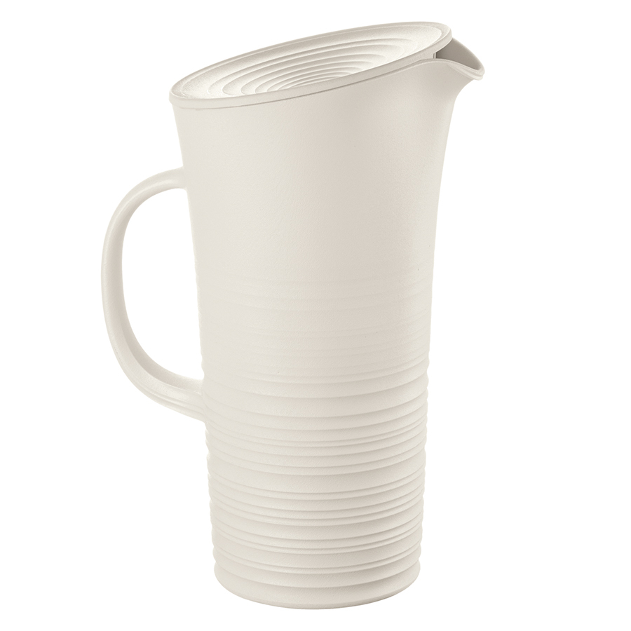 Объемный кувшин из переработанного пластика с фактурой, имитирующей глину, подойдет для подачи освежающих напитков. Крышка удерживает лед, мяту, кусочки фруктов внутри кувшина, предотвращая попадание ингредиентов в бокал.