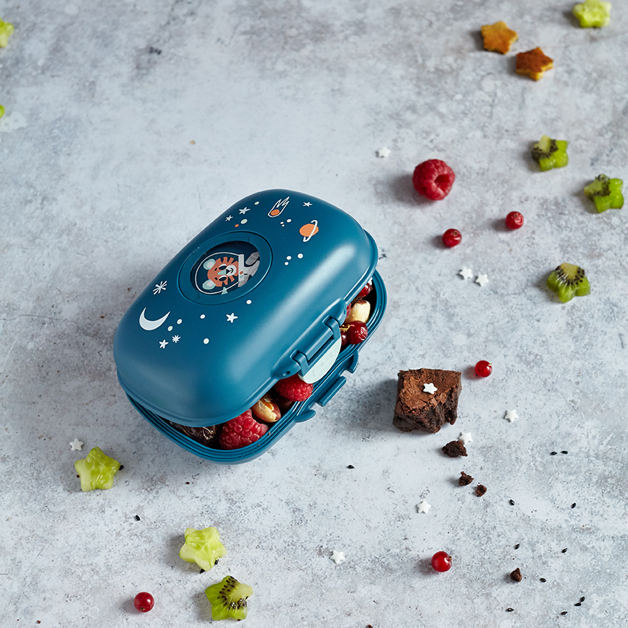 Ланч-бокс изготовлен из качественного пищевого пластика PBT (полибутелентерефталат), который полностью безопасен как для человека, так и для окружающей среды. PBT не содержит бисфенола А и других вредных веществ, а также легко перерабатывается. Надежный замок обеспечивает полную герметичность. Съемные жетоны на крышке ланч-бокса позволяют детям создавать свой собственный дизайн. В комплект входят 4 жетона, которые можно менять. Ланч-бокс не предназначен для транспортировки жидкостей.