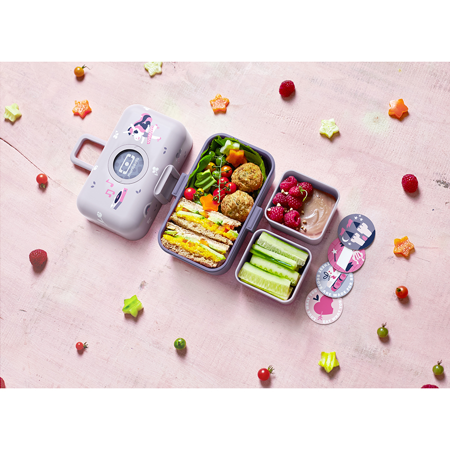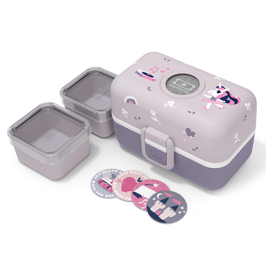 Ланч-бокс изготовлен из качественного пищевого пластика PBT (полибутелентерефталат), который полностью безопасен как для человека, так и для окружающей среды. PBT не содержит бисфенола А и других вредных веществ, а также легко перерабатывается. Надежный замок обеспечивает полную герметичность. Съемные жетоны на крышке ланч-бокса позволяют детям создавать свой собственный дизайн. В комплект входят 4 жетона, которые можно менять.