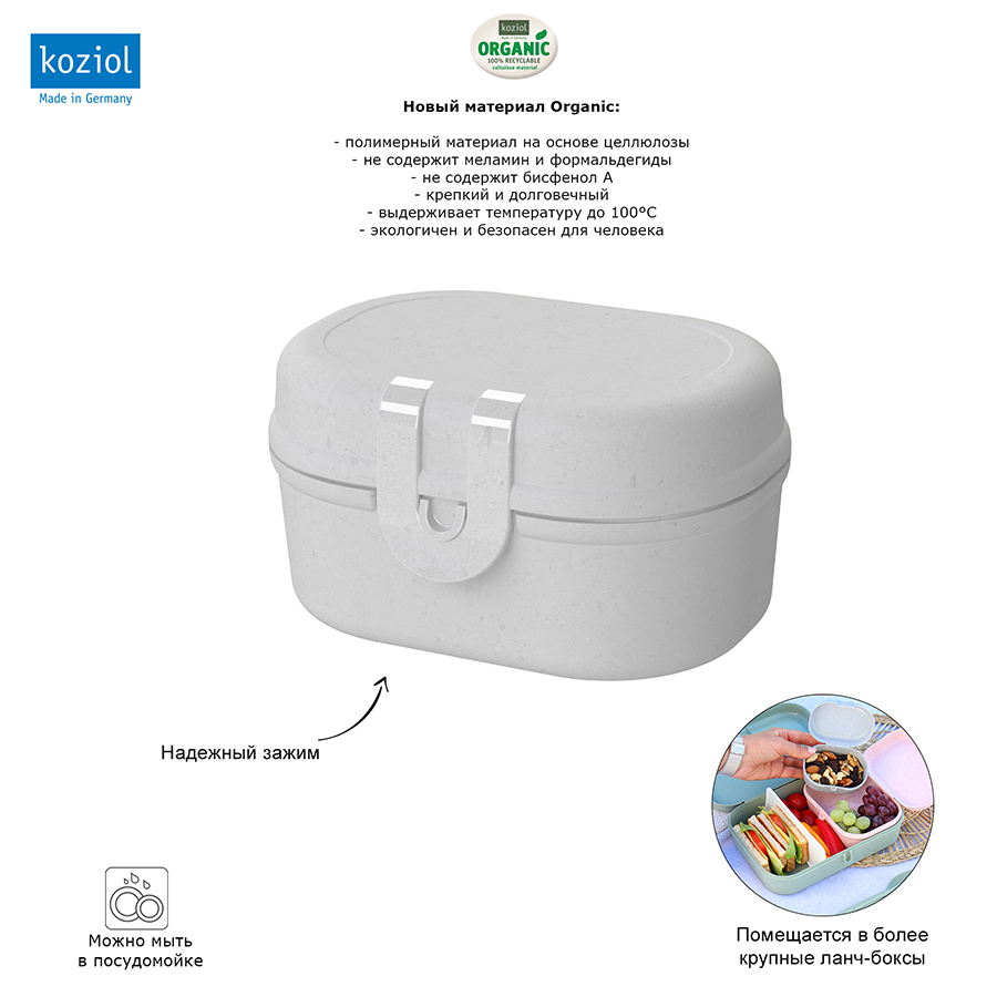 Ланч-бокс Pascal MINI – компактная коробка для школьных обедов или перекусов на работе. За счет обтекаемой формы и плавных линий емкость можно переносить в сумке или рюкзаке без риска повредить тетради, документы или другие важные предметы. Бокс вмещает орехи, печенье, фрукты и другие закуски. Изготовлен из органического материала на основе целлюлозы, не содержит формальдегидов, бисфенола А. Ланч-бокс можно мыть в посудомоечной машине. Особенности: - надежный зажим - помещается в более крупные ланч-боксы Pascal S и L Производство: Германия