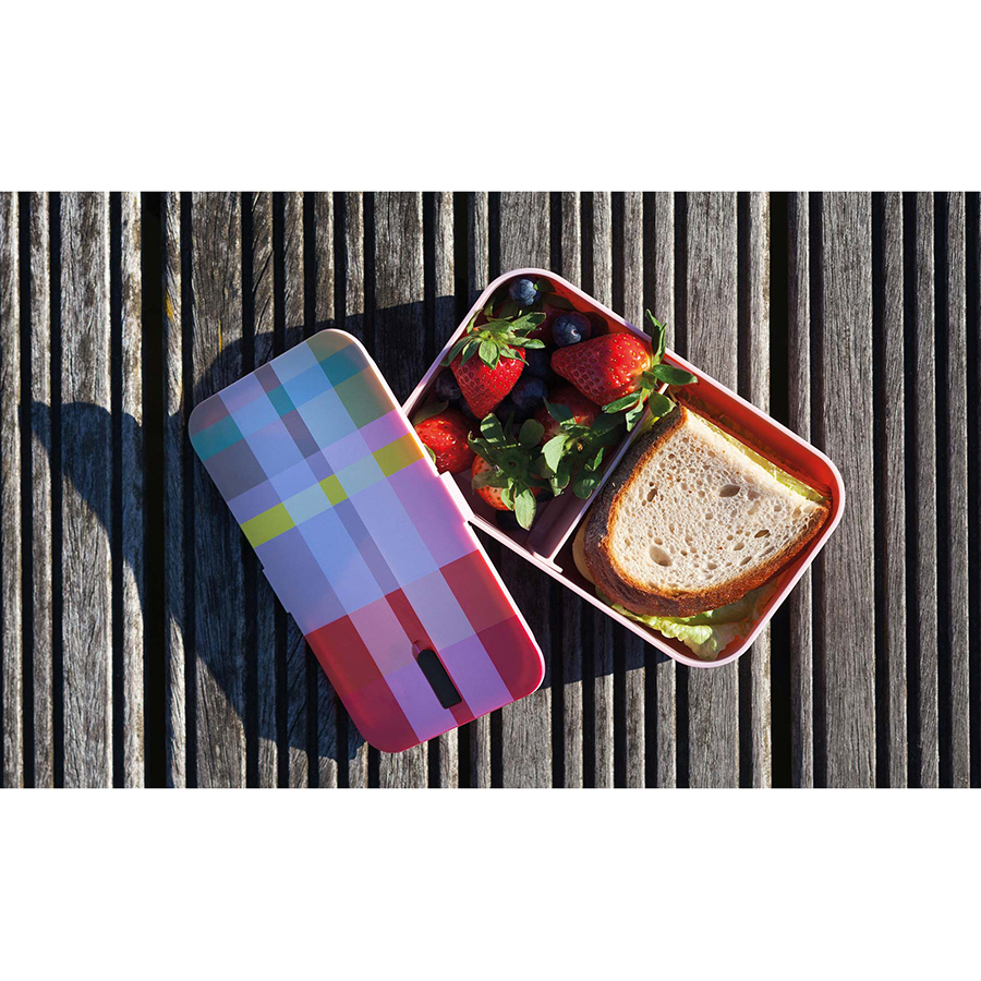 Герметичный контейнер сохраняет свежесть сэндвичей, салатов, десертов, а регулируемая стенка позволяет разграничивать два разных блюда. Ланч-бокс имеет закрывающееся вентиляционное отверстие. Пластик не содержит бисфенола А.Можно мыть в посудомоечной машине и греть в микроволновой печи, предварительно сняв крышку.