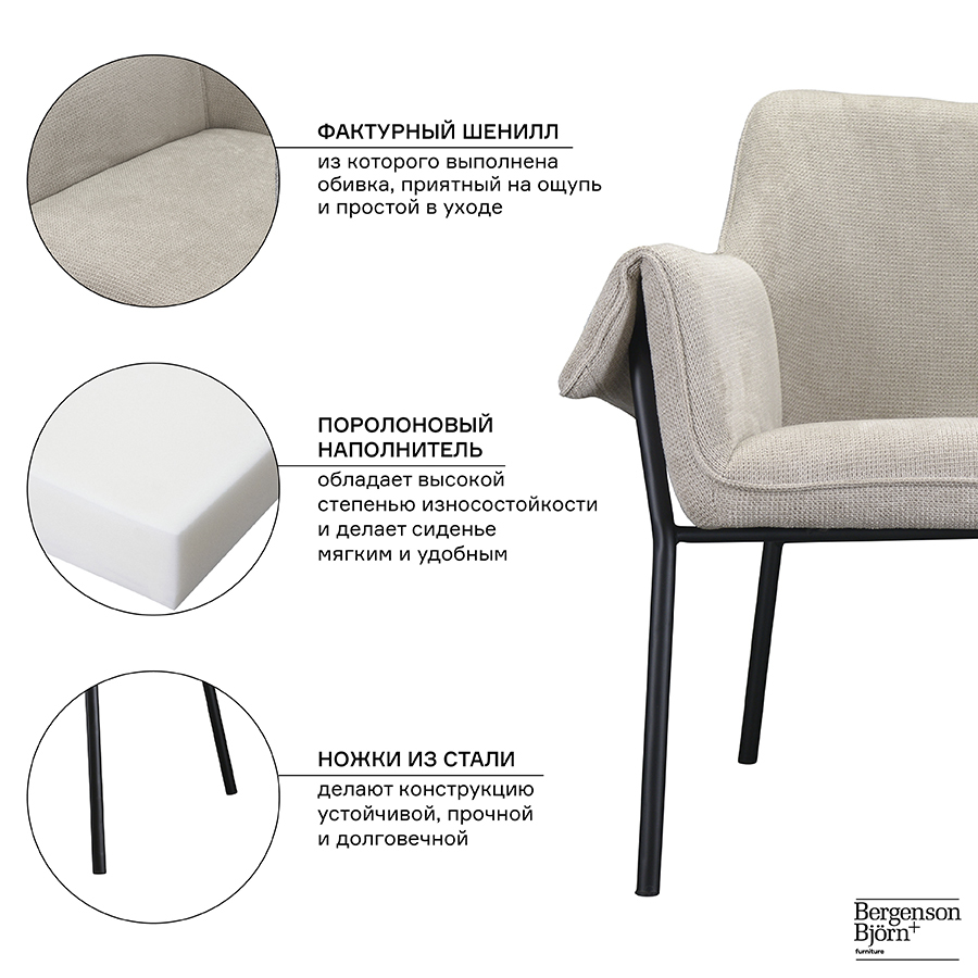 Материалы: 93% полиэстер, 7% нейлон, фанера, железо, поролон. Размеры: 76х61х75 см. Высота сиденья: 43 см. Ширина сиденья: 45 см. Глубина сиденья: 49 см. Высота спинки: 37 см. Ширина спинки: 42 см. Цвет: серо-бежевый. Истираемость ткани по шкале Мартиндейла ?40000.