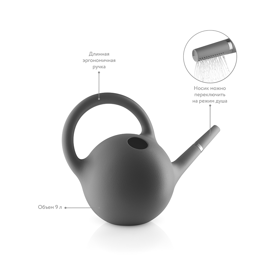 Круглая форма — это удачное и функциональное решение для лейки объемом 9 л, чтобы она не казалась громоздкой и ей было удобно пользоваться.