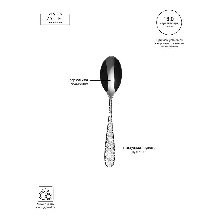 Glamour — коллекция столовых приборов из нержавеющей стали 18.00, которая производится по самым высоким стандартам качества. Текстурная выделка рукояток и зеркальная полировка делает эту коллекцию воплощениемм гламура и шика. Приборы устойчивы к коррозии, ржавчине и окислению. Бренд Viners даёт гарантию на коллекцию 25 лет.