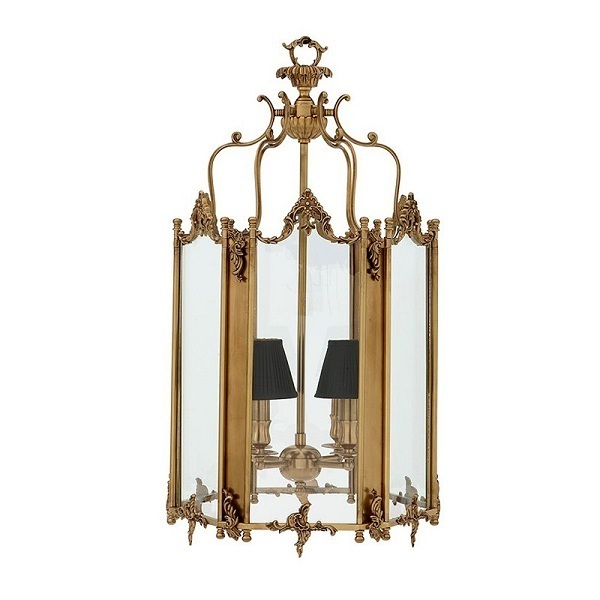 Подвесной светильник из металла цвета состаренной латуни. Дизайн светильника выполнен в виде фонаря со стеклянными створками. Абажуры чёрного цвета.