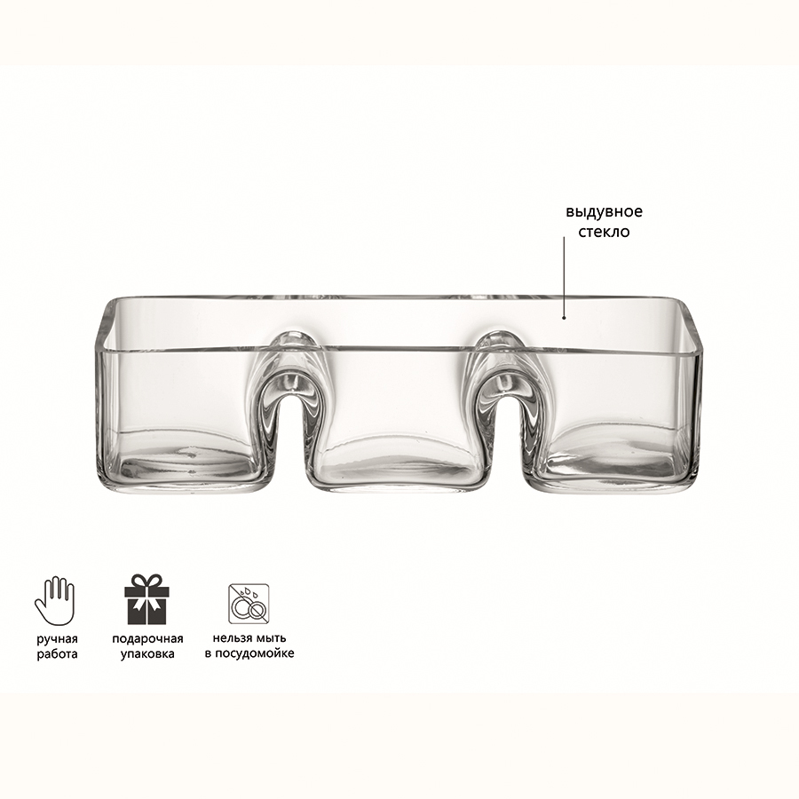 Менажница из стекла ручной работы идеально подойдет для сервировки оливок, орехов, сухофруктов, конфет, крекеров и других закусок. Классический дизайн делает ее универсальным столовым аксессуаром, который подходит для подачи самых разных блюд. Практичная и стильная деталь, которая придется по душе всем, кто любит устраивать домашние праздники.
