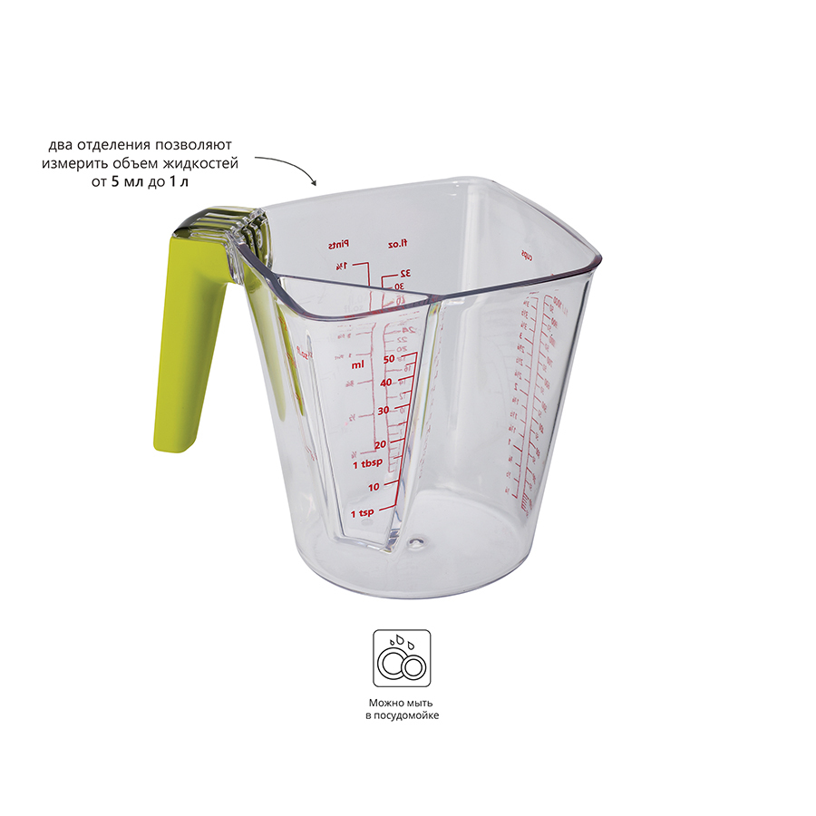 Универсальный стакан с двумя отделениями для измерения жидкостей как малых объемов от 5 мл до 1 литра. Благодаря прямым углам жидкости очень удобно переливать, а мягкая силиконовая ручка обеспечивает дополнительный комфорт. Можно мыть в посудомоечной машине.