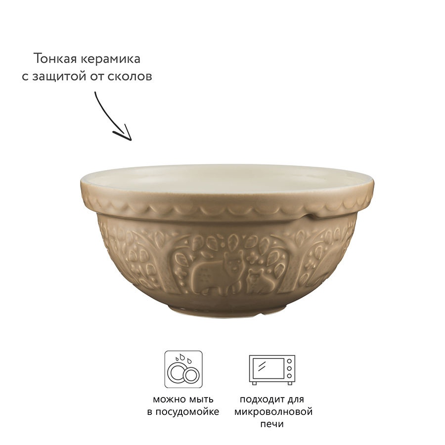 Миска In the Forest Bear поможет облегчить процесс приготовления блюд на вашей кухне. Посуда предназначена для замешивания теста, смешивания ингредиентов, а также подачи салатов или фруктов. Дизайнеры украсили изделие тисненым рисунком в виде лесного пейзажа. Чаша выполнена из тонкой керамики, которая отличается прочностью и стойкостью к сколам. Изделие подходит для использования в микроволновой печи и мытья в посудомоечной машине.