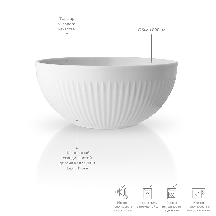 Глубокая миска идеальна для гранолы или каши на завтрак, а также бульонов или салатов. Вы можете хранить в ней небольшие снеки или конфеты. Изделие из качественного фарфора можно использовать в духовке, морозильной камере, микроволновой печи и мыть в посудомоечной машине. Современная модная классика! Коллекция белоснежного фарфора Legio Nova была выпущена в 2015 году, в 2017 ее дополнили предметы лаконичного серого цвета. Рельефные бортики напоминают коллекционные столовые сервизы, благодаря чему посуда выглядит элегантно, изысканно и никогда не выйдет из моды.