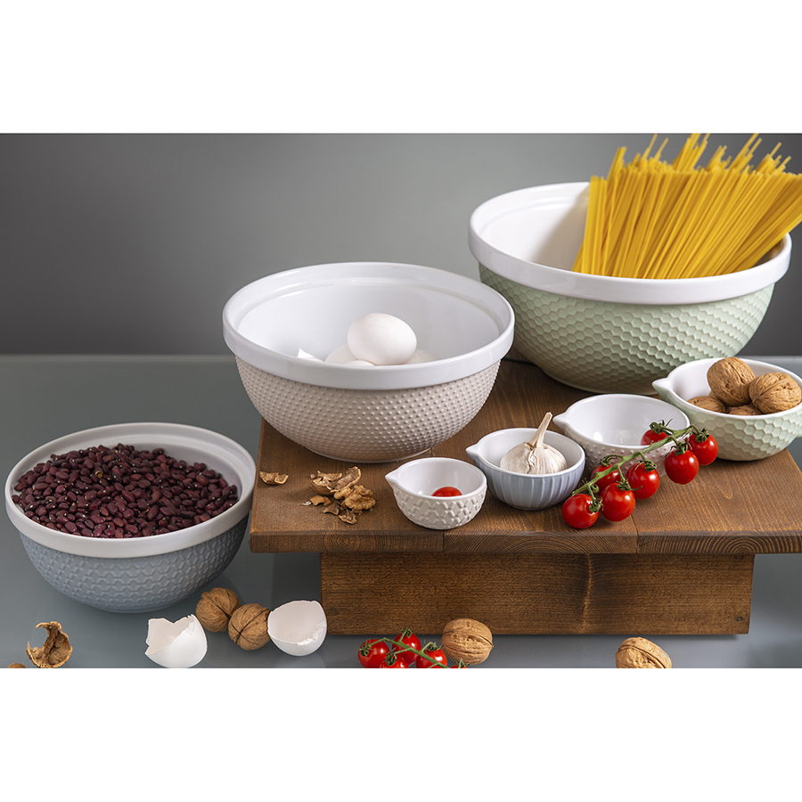 Миски не предназначены для использования металлического венчика и миксера. Желательно использовать венчик с силиконовым прутьями, силиконовую лопатку или деревянные ложки.