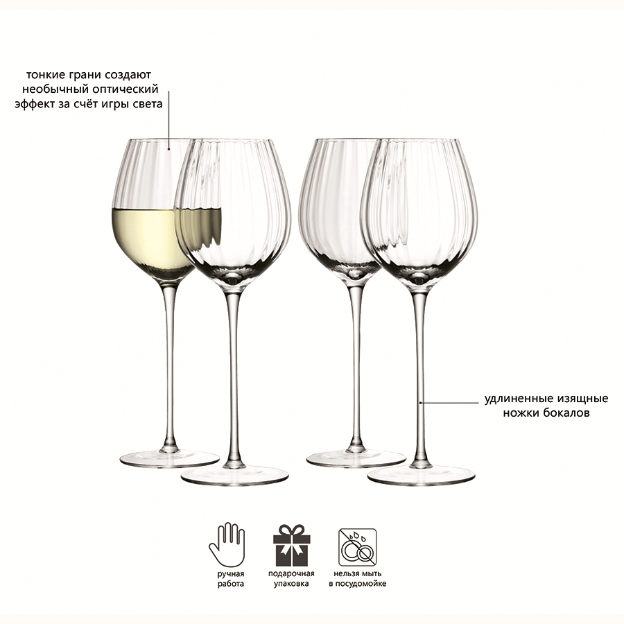 Добавьте изысканности вашей сервировке с бокалами для белого вина Aurelia. Комбинируйте их с бокалами для красного вина и стаканами для воды, чтобы создать завершенную композицию. Бокалы упакованы в стильную коробку, поэтому станут отличным подарком. Набор состоит из 4-х бокалов. Объем каждого бокала 430 мл. Предметы коллекции Aurelia выполнены из прозрачного выдувного стекла. Особенности коллекции — тонкие грани, создающие необычный оптический эффект за счет игры света, и удлиненные тонкие ножки бокалов. Изысканная и утонченная Aurelia — идеальный выбор для торжественных и официальных мероприятий. Изделия рекомендуется мыть вручную в тёплой мыльной воде и вытирать насухо мягкой тканью. Мелкие пузырьки внутри выдувного стекла не являются браком (круглые пузырьки < 3 мм и овальные пузырьки < 5 мм): это допустимые индивидуальные особенности изделий, изготовленных вручную.