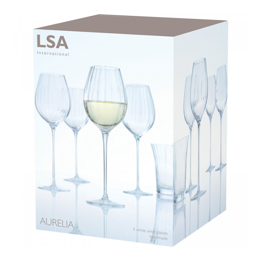 Aurelia – бокалы для белого вина из выдувного стекла с элегантными чашами и длинными изящными ножками, изготовленные ручным способом. Их прозрачные стенки, декорированные рельефным узором, красиво отражают свет, создавая за столом праздничную атмосферу.