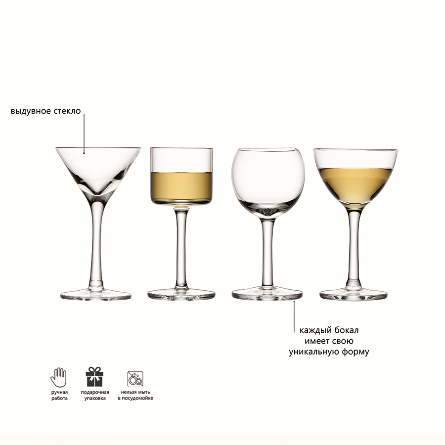 Материал: выдувное стекло. Объем: 50-54 мл. Количество в наборе: 4 шт.