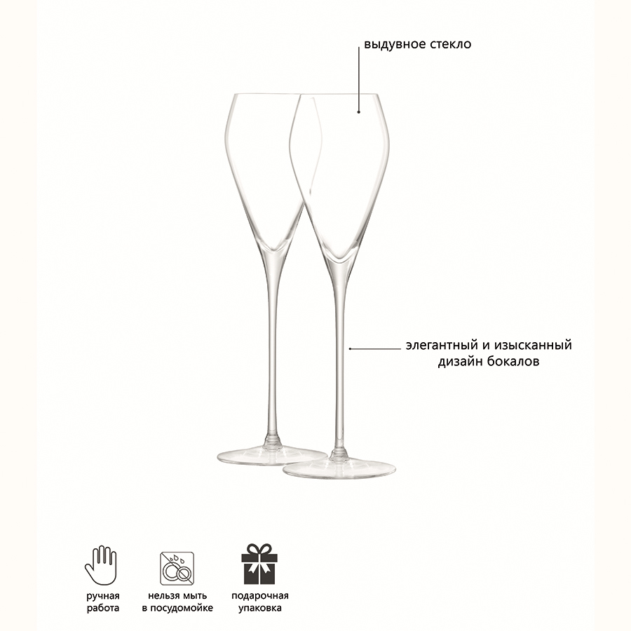 Бокалы из коллекции Wine— воплощение элегантности, минимализма и изысканности. Набор состоит из 2-х бокалов Prosecco, которые идеально подходят для сервировки игристых вин и легких коктейлей на их основе. Безупречное качество стекла ручной работы от LSA International и утонченный дизайн делает этот сет прекрасным подарком на любой праздник. Изделия рекомендуется мыть вручную в тёплой мыльной воде и вытирать насухо мягкой тканью. Мелкие пузырьки внутри выдувного стекла не являются браком (круглые пузырьки < 3 мм и овальные пузырьки < 5 мм): это допустимые индивидуальные особенности изделий, изготовленных вручную.