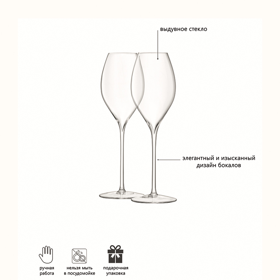 - Удлиненная ножка создает изысканный, утонченный силуэт и не дает шампанскому нагреваться от руки.