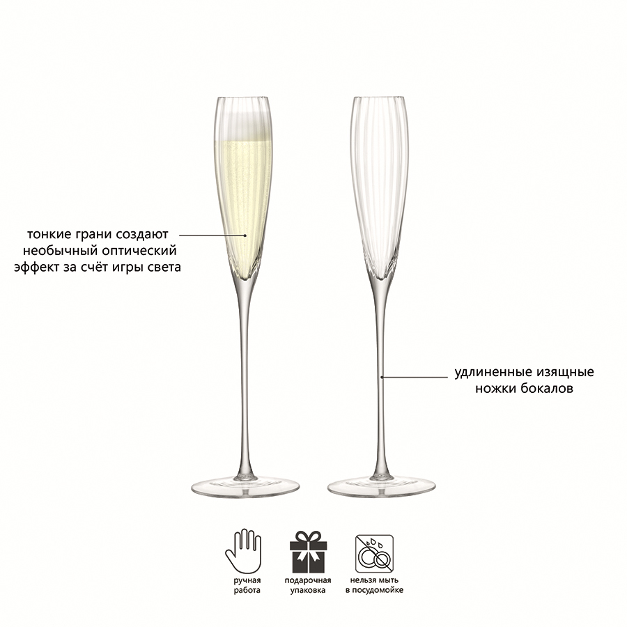 Добавьте изысканности вашей сервировке с классическими бокалами-флейтами для шампанского Aurelia. Комбинируйте их с бокалами для белого и красного вина, и стаканами для воды, чтобы создать завершенную композицию. Бокалы упакованы в стильную коробку, поэтому станут отличным подарком. Набор состоит из 2-х бокалов. Объем каждого бокала 165 мл. Предметы коллекции Aurelia выполнены из прозрачного выдувного стекла. Особенности коллекции — тонкие грани, создающие необычный оптический эффект за счет игры света, и удлиненные тонкие ножки бокалов. Изысканная и утонченная Aurelia — идеальный выбор для торжественных и официальных мероприятий. Изделия рекомендуется мыть вручную в тёплой мыльной воде и вытирать насухо мягкой тканью. Мелкие пузырьки внутри выдувного стекла не являются браком (круглые пузырьки < 3 мм и овальные пузырьки < 5 мм): это допустимые индивидуальные особенности изделий, изготовленных вручную.